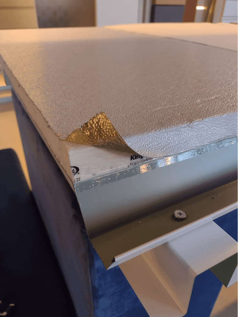 - Camada intermediária: núcleo de PIR (poliisocianurato), que contribui para manter temperaturas internas mais estáveis e reduzir o consumo de energia com climatização.